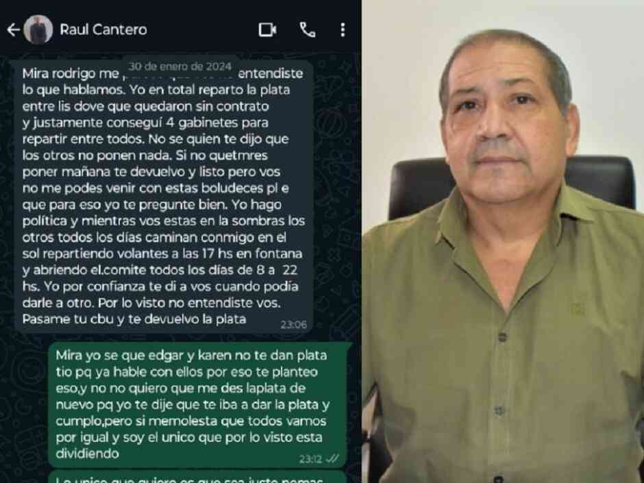 “Mirá, Rodrigo”, le respondió Cantero en uno de los chats entregados a la justicia. “Me parece que vos no entendiste lo que hablamos. Yo en total reparto la plata entre los que quedaron sin contrato y justamente conseguí 4 (contratos de) gabinetes para repartir entre todos. No sé quien te dijo que los otros no ponen nada. Si no querés poner, mañana te devuelvo y listo. Pero vos no me podés venir con estas boludeces (…) para eso te pregunté bien”, le recordó.